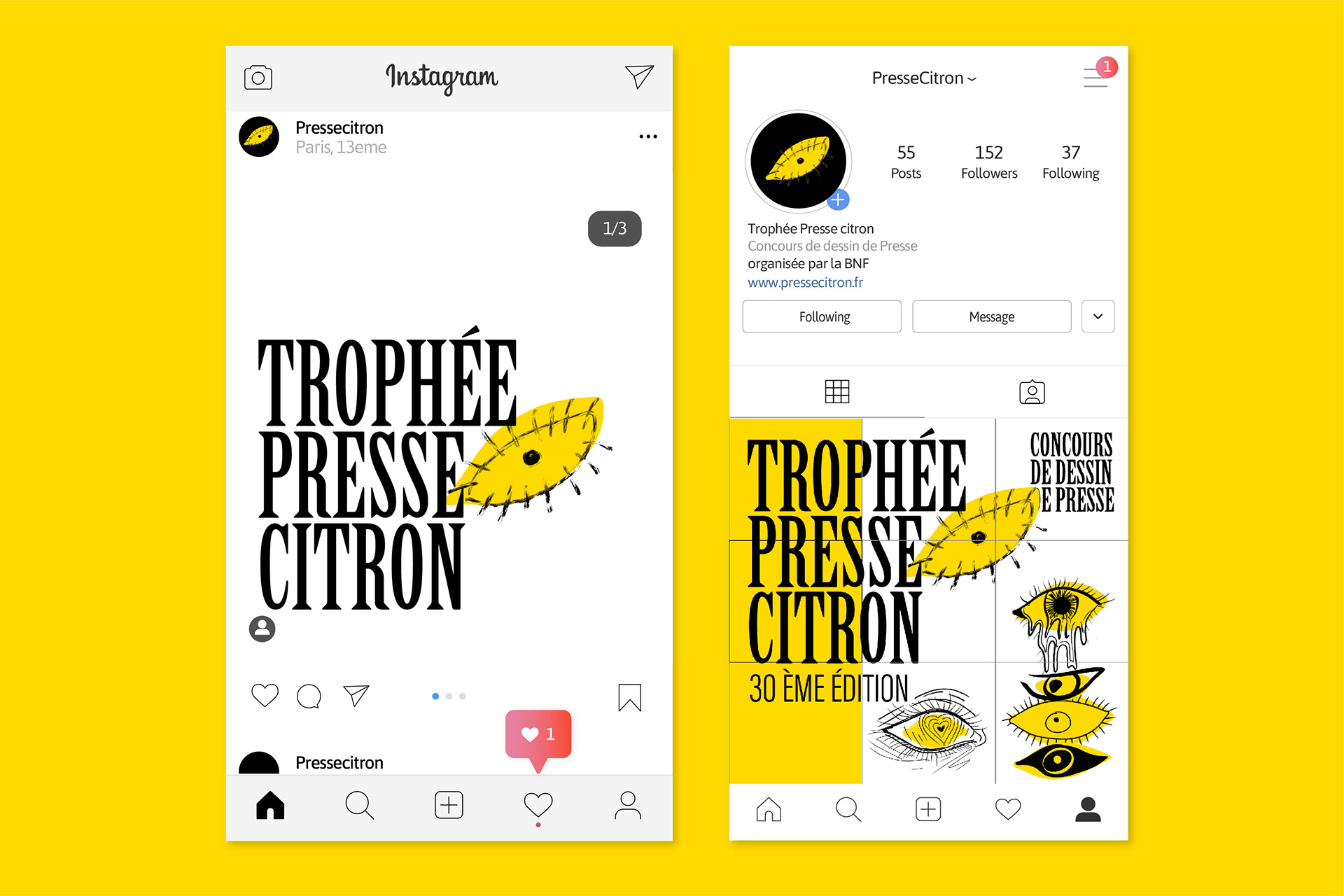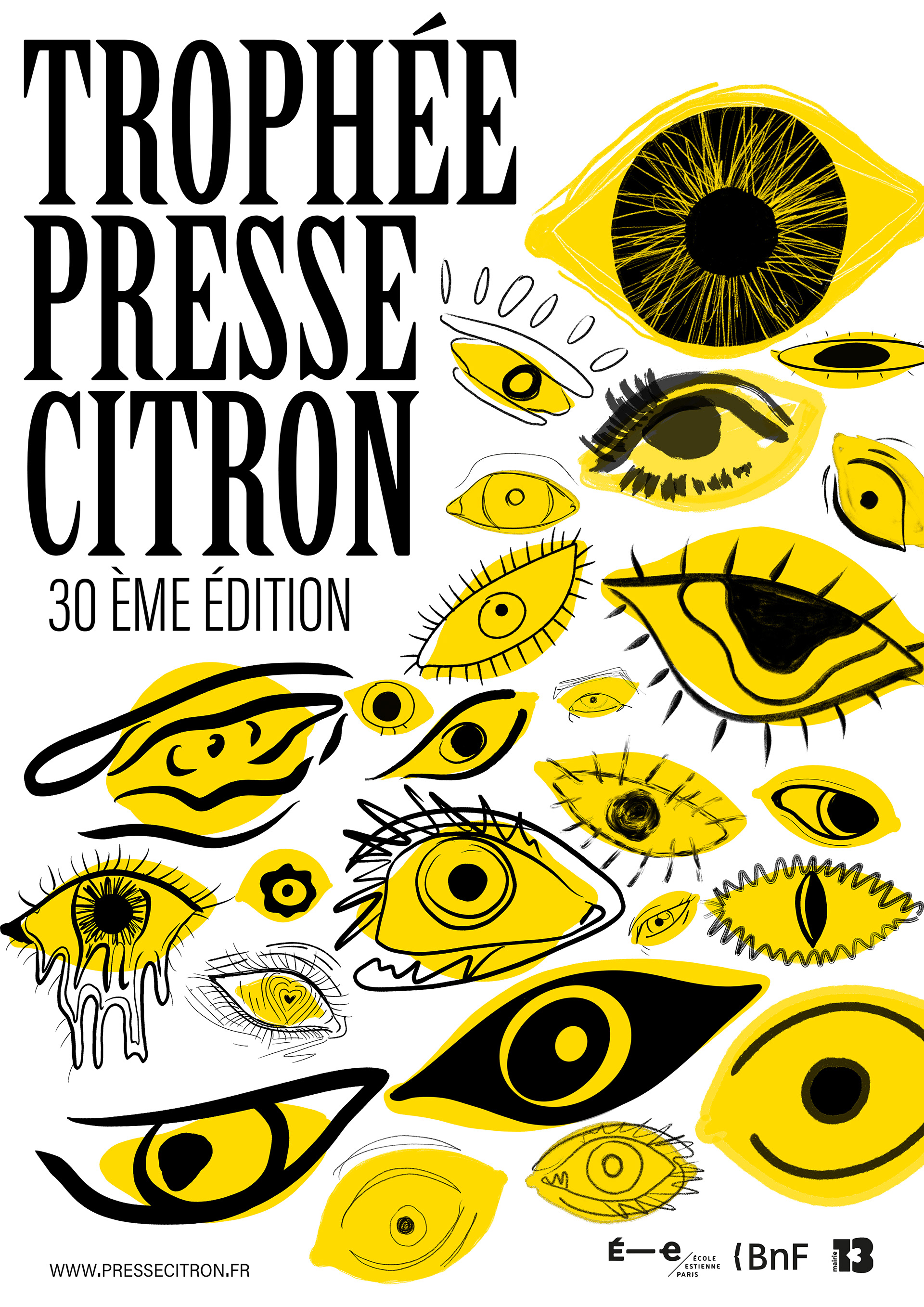 The new communication for the Presse Citron press cartoon competition, organized by the Bnf and our master's class. Eyes symbolize the viewpoints of press cartoonists. The number of the eyes show to mark the 20th anniversary of the competition.